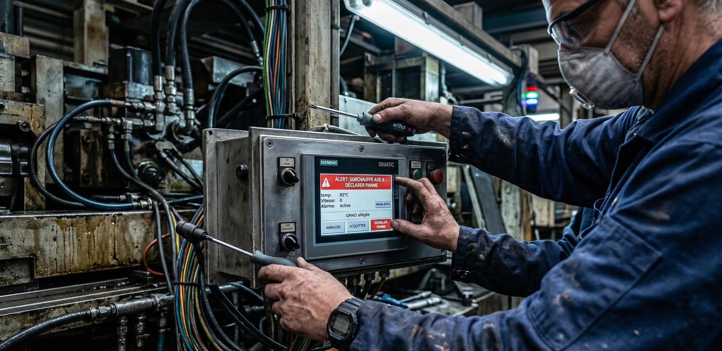Bénéfices : Réduction radicale du temps de déclaration des pannes, communication fluide entre production et maintenance, suivi de l'historique des pannes par machine pour une maintenance préventive.